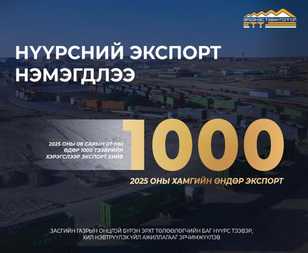 Үүрэг даалгаврын биелэлтийг хангуулах хүрээнд “Эрдэнэс Тавантолгой” ХК-ийн Засгийн газрын Онцгой бүрэн эрхт төлөөлөгчийн баг нарийвчилсан төлөвлөгөө боловсруулж тодорхой үр дүнд хүрч байна. 2025 оны наймдугаар сарын 7-ны өдөр 1000 автомашин нүүрс экспортолсны 851 нь урт хугацаат гэрээтэй аж ахуйн нэгж, 149 нь биржийн арилжаагаар худалдан борлуулсан аж ахуйн нэгжүүдийн нүүрс байна. Энэ нь 2025 оны хамгийн өндөр үзүүлэлттэй экспорт хийсэн өдөр байлаа.