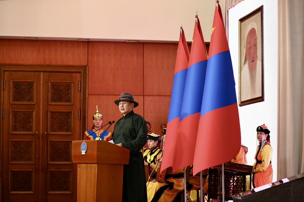 Ерөнхийлөгч У.Хүрэлсүх “Чингис хаан” тэргүүн зэргийн одон гардуулсны дараа хэлсэн үгийг хүргэж байна.
