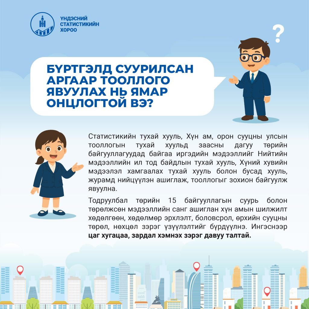 Монгол Улсын иргэн та Хүн ам, орон сууцны завсрын тооллогод хамрагдахдаа “E-Mongolia” системээр нэвтэрч, өөрийн болон өрхийн гишүүдийн мэдээллээ шалгаж баталгаажуулаарай. Тооллогод хамрагдах холбоос: www.2025.mn,