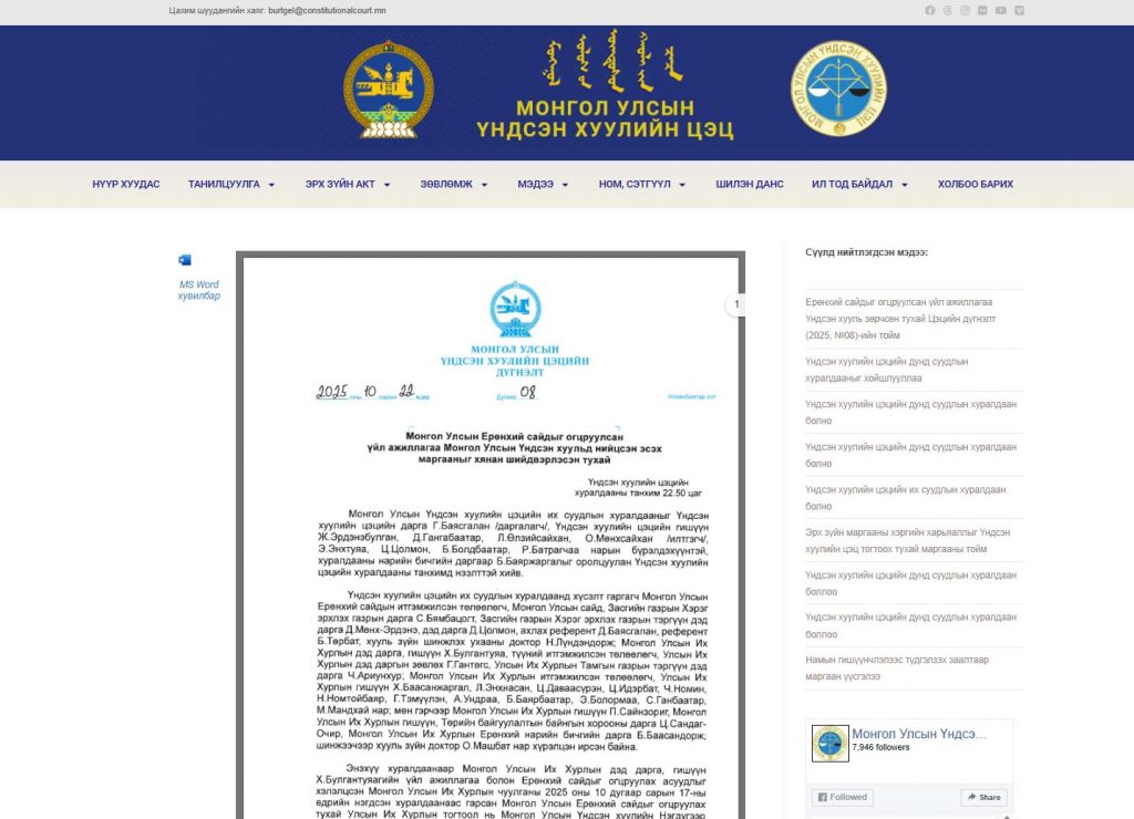 8.Ерөнхий сайдыг огцруулсан үйл ажиллагаа Үндсэн хууль зөрчсөн тухай Үндсэн хуулийн цэцийн 2025 оны 10 дугаар сарын 22-ны өдрийн их суудлын хуралдаанаас гаргасан 08 дугаар дүгнэлтийг мөн сарын 23-ны өдөр Үндсэн хуулийн цэцийн цахим хуудаст байршуулж, ил тод байх зарчмыг шуурхай хангаж ажиллалаа.