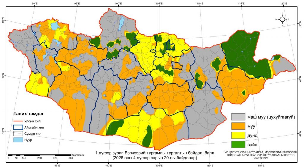 Бэлчээрийн ургамлын ургалтын нөхцөл байдлын талаар 2026 оны дөрөвдүгээр сарын 20-ны байдлаар бэлчээрийн ургамлын ургалтын төлөв байдлыг дүгнэхэд нийт нутгийн 60 гаруй хувьд ургамал цухуйсан байна.